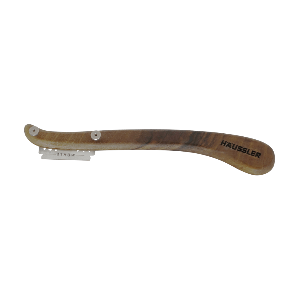 Exquisiter Klingenhalter aus hochwertigem Walnussholz zum stilvollen Einschneiden von Brot, Baguette & Co. Der Halter wird mit einer Rasierklinge, einem Klingenschutz und einem Baumwoll-Etui geliefert.