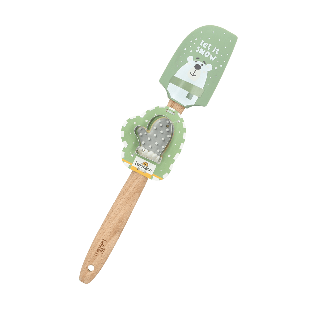 Der Teigschaber mit Motiv und Ausstecher ist der ideale Helfer in jeder Küche – zum Rühren, Schaben und Ausstechen von Teig.