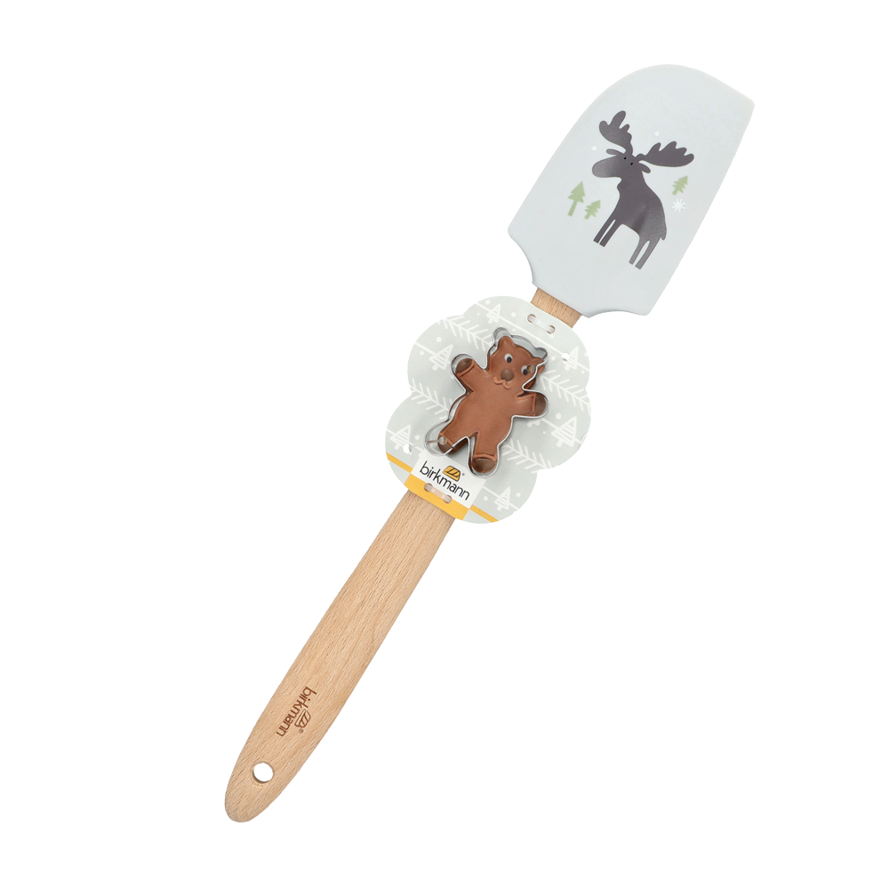 Der Teigschaber mit Motiv und Ausstecher ist der ideale Helfer in jeder Küche – zum Rühren, Schaben und Ausstechen von Teig.