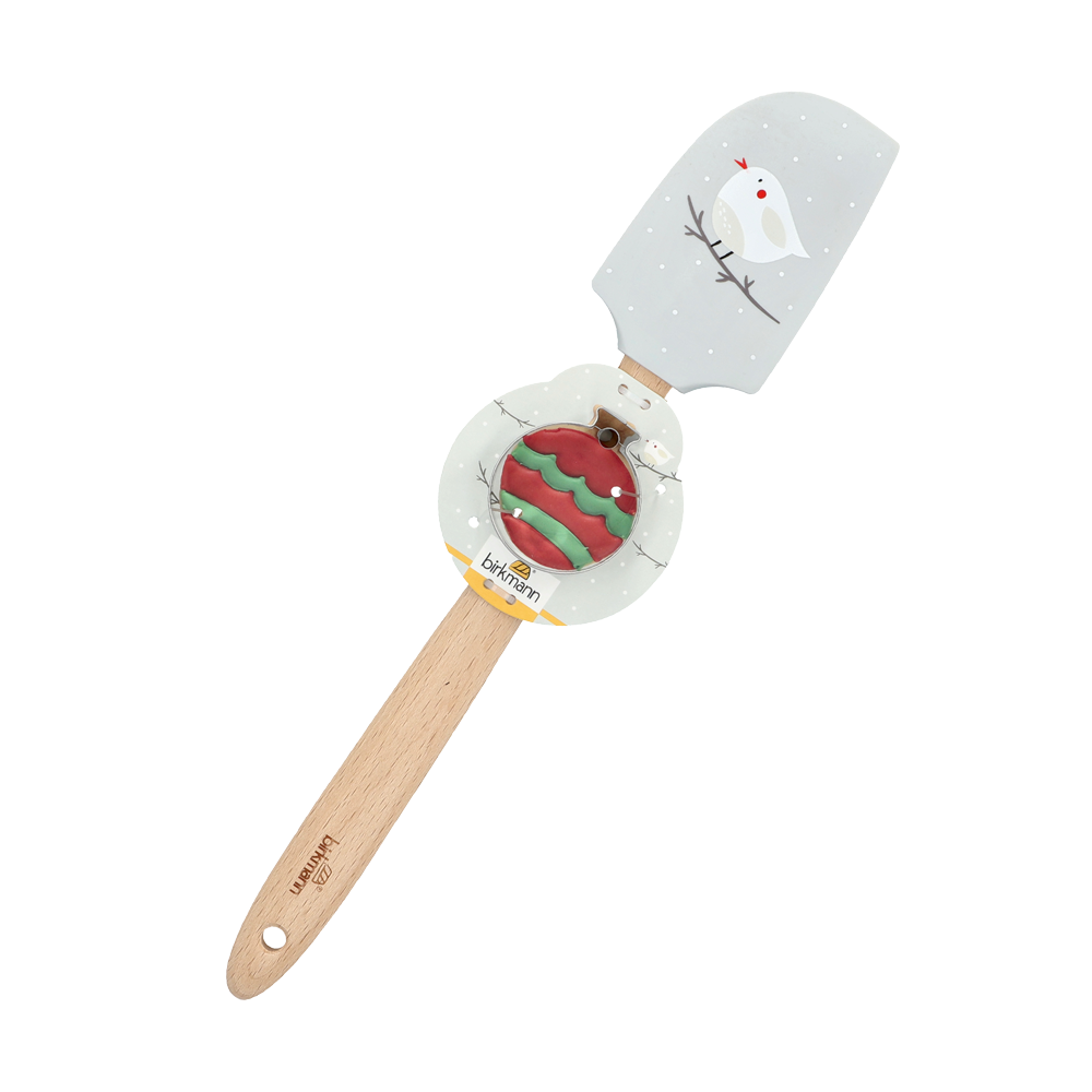 Der Teigschaber mit Motiv und Ausstecher ist der ideale Helfer in jeder Küche – zum Rühren, Schaben und Ausstechen von Teig.