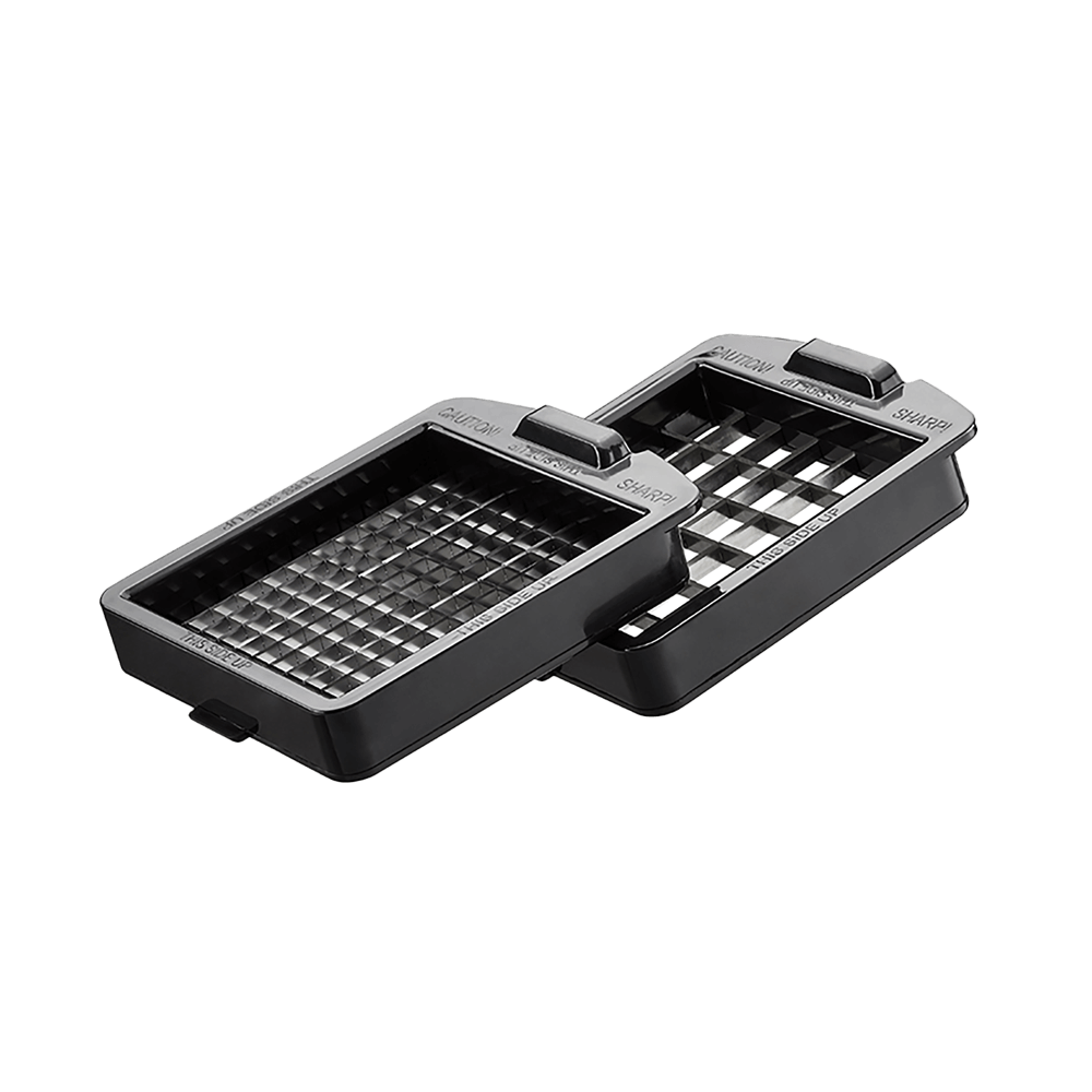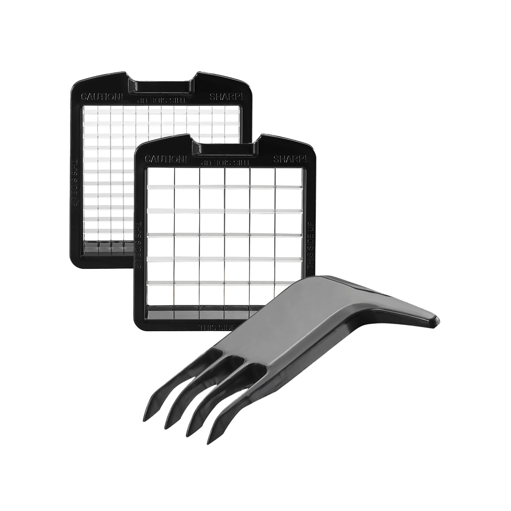 Zwei austauschbare Schneidgitter ermöglichen die Wahl zwischen feinen (7 x 7 mm) und groben (13 x 13 mm) Stiften oder Würfeln – ideal für Rohkost, Suppeneinlagen, Pommes Frites oder Eintöpfe.