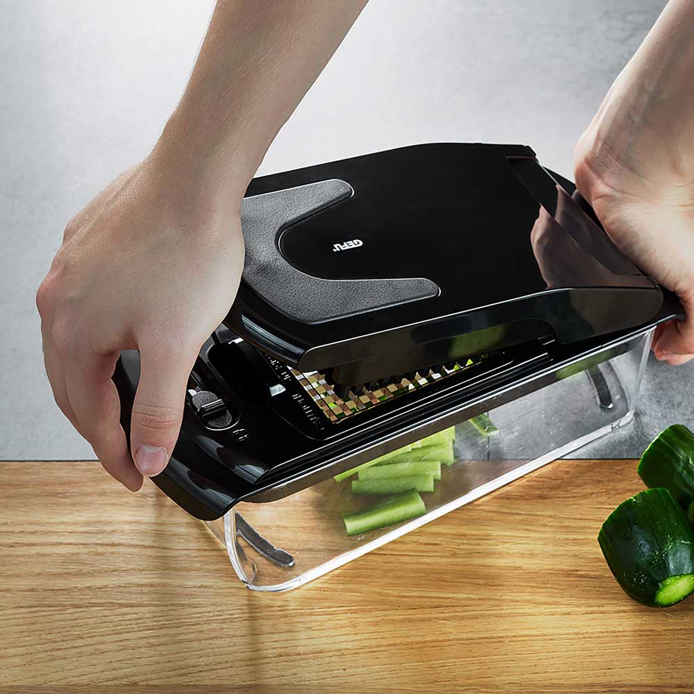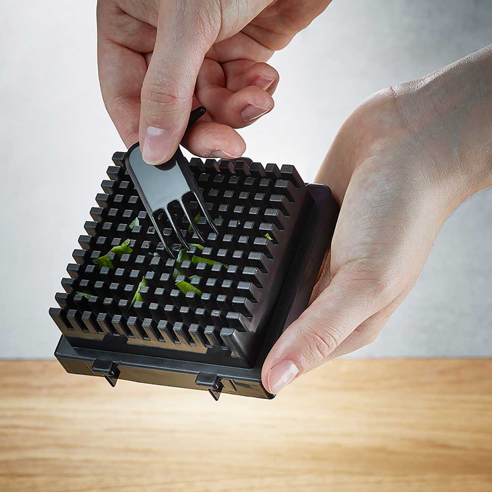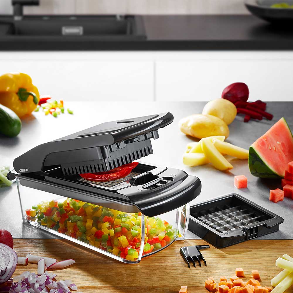 Mit dem praktischen Würfelschneider lassen sich Obst, Gemüse und sogar Käse schnell und bequem in gleichmäßige Würfel oder Stifte schneiden.