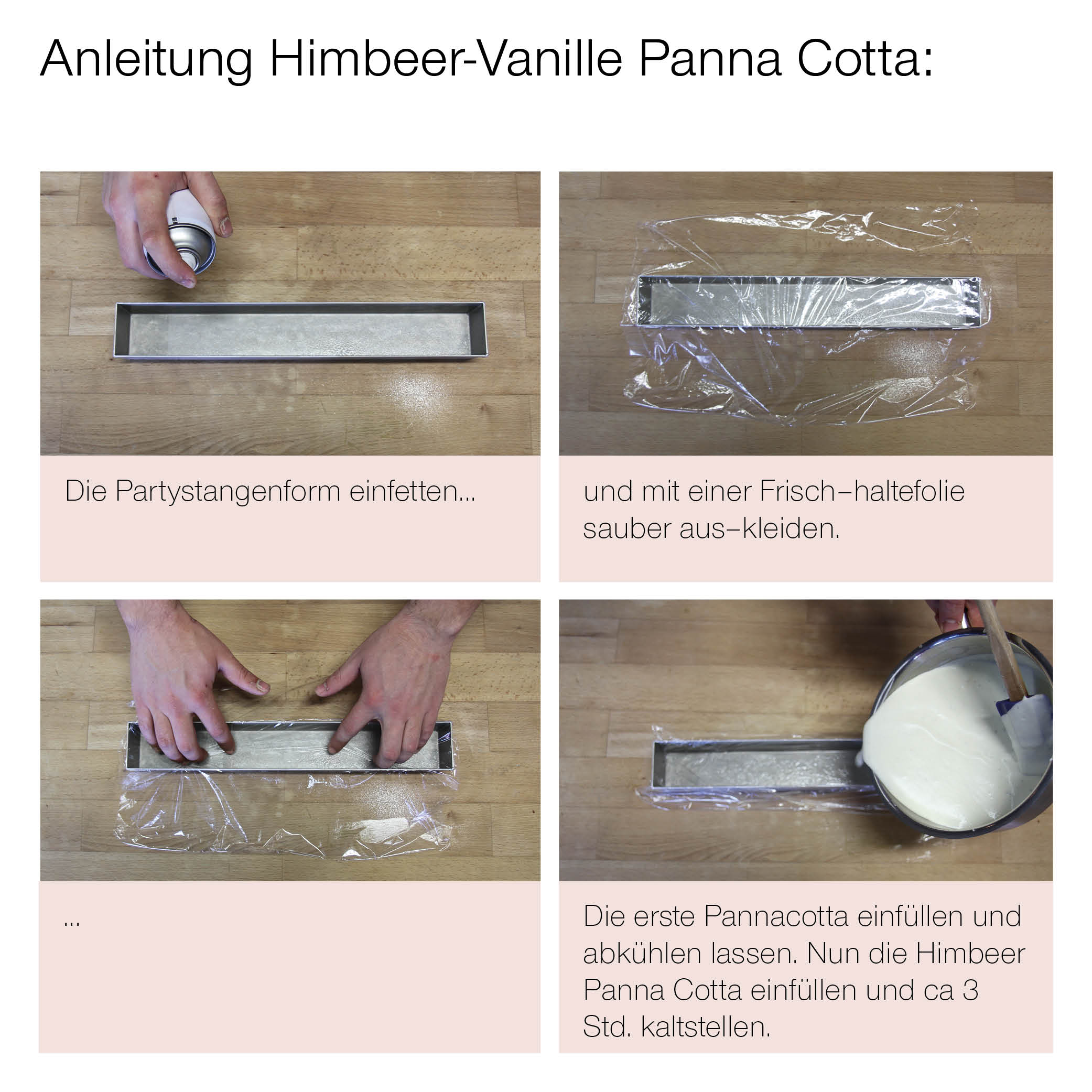 Nach dem Backen den Dessertboden auf die Partystangenform zuschneiden und auf die kalte Himbeer Pana Cotta legen. Der restliche Dessertboden kann für unser Rezept „Desserts im Glas“ oder für eine Biskuitroulade verwendet werden. Einfach einfrieren und nach Belieben verwenden.