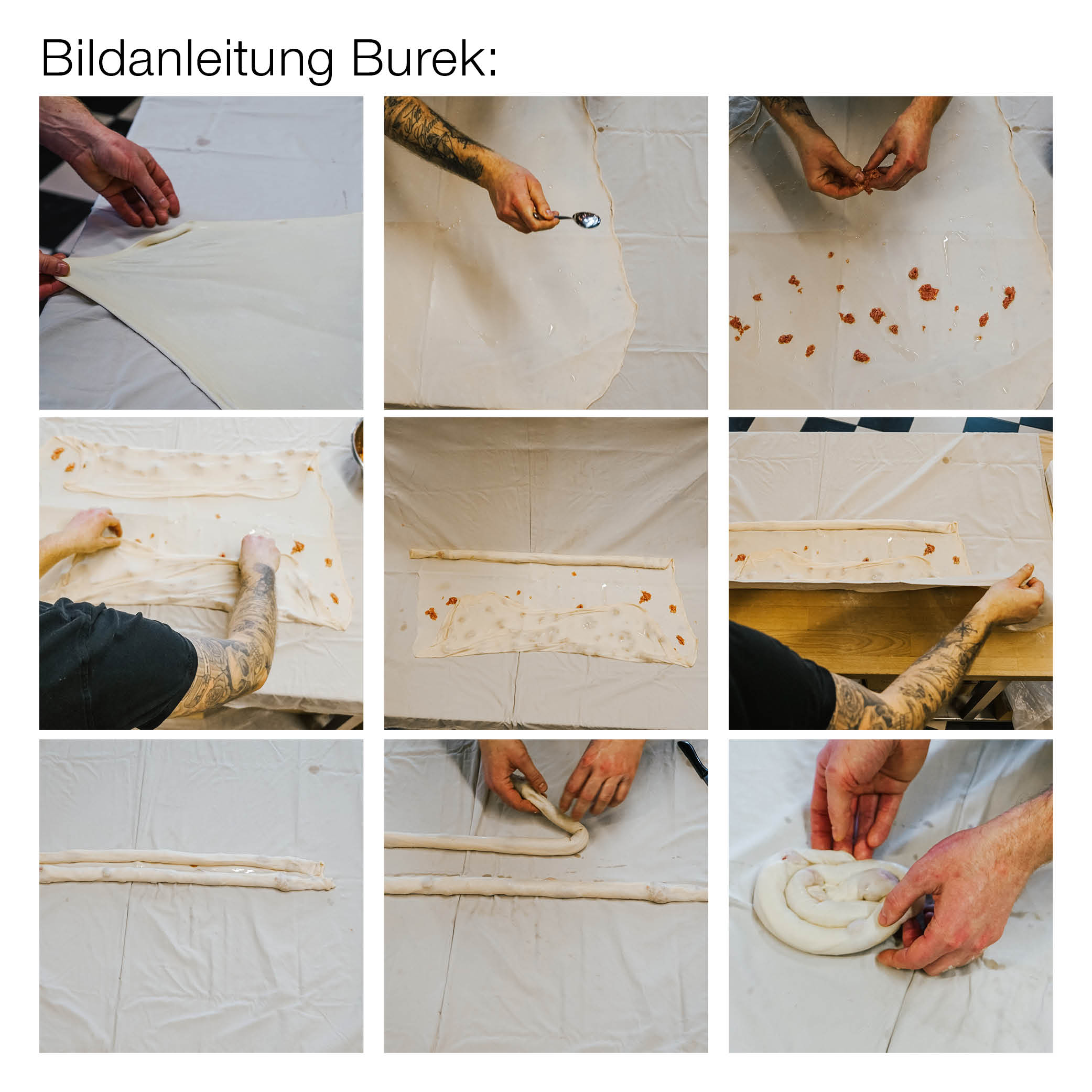 Die Zutaten zusammen ergeben ca. 1.335 g Gesamtteig. Eine Portion ergibt 8 Burek Schnecken à 166 g.