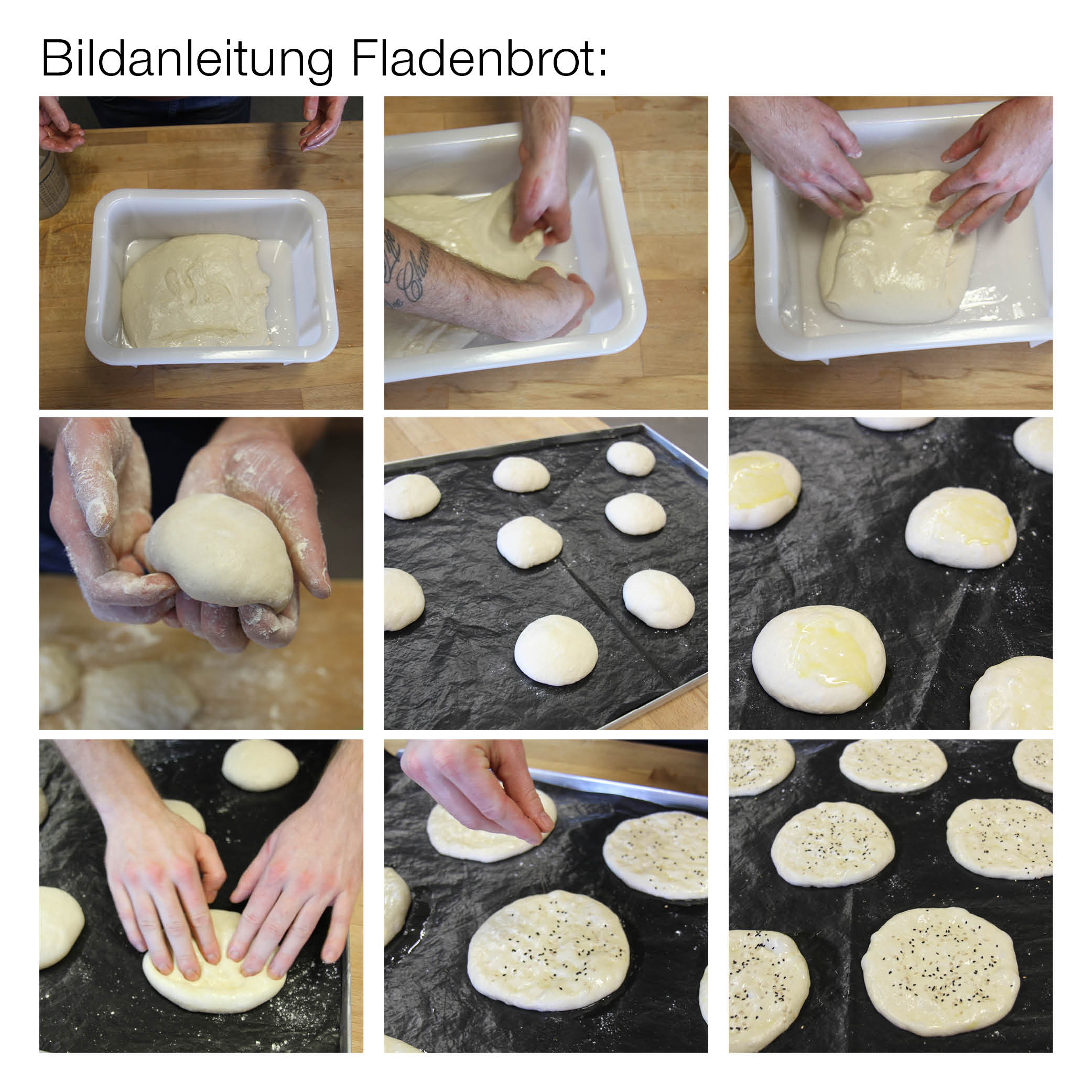 Die Zutaten zusammen ergeben ca. 1.720 g Gesamtteig. Eine Portion ergibt 11 Fladenbrote à 150 g.