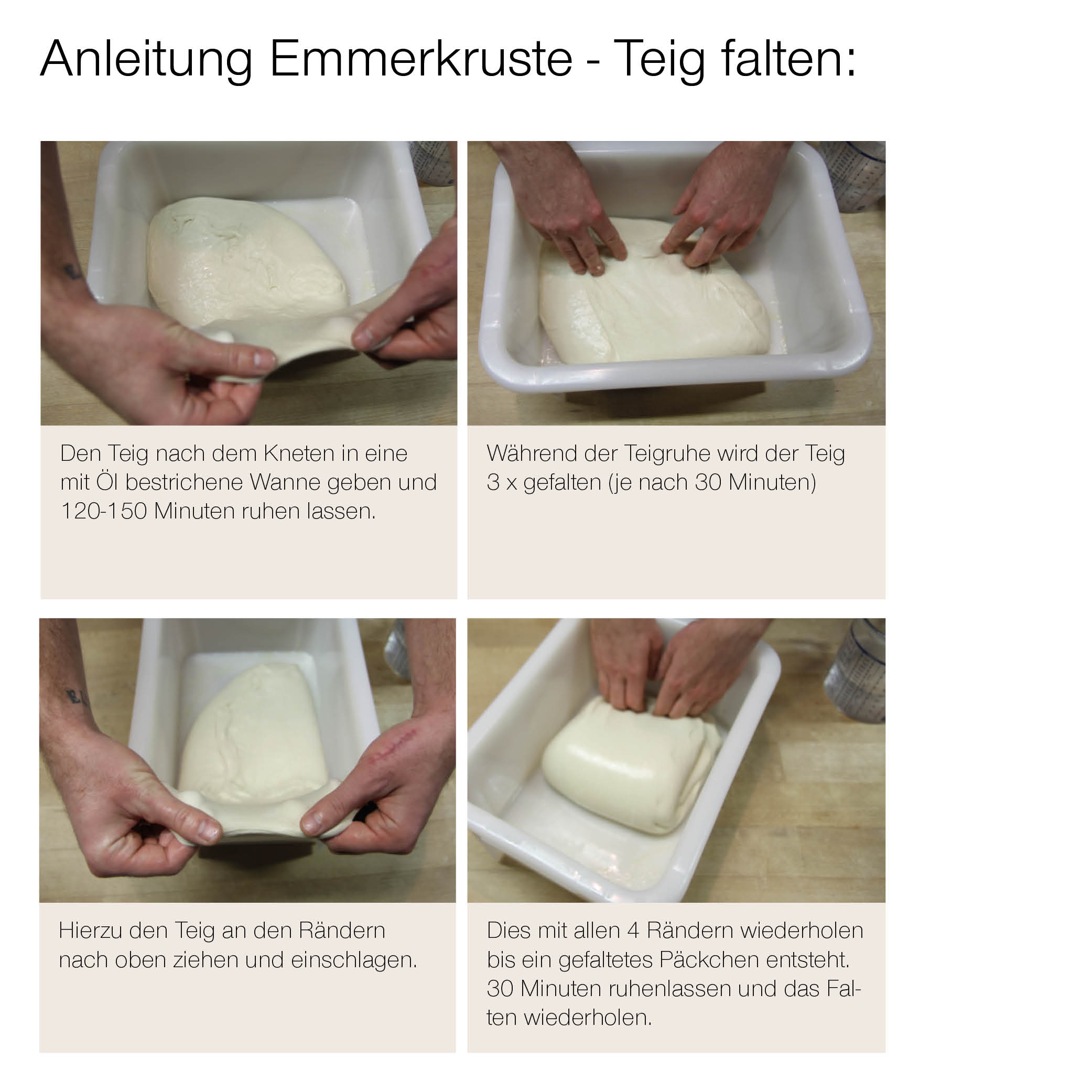 Alle Zutaten für den Hauptteig ca. 8 Minuten langsam kneten und 2 Minuten schnell kneten. Die Teigtemperatur sollte ca. 27° C betragen. Den Teig in einer Wanne 120 - 150 Minuten ruhen lassen. In der Zeit den Teig 3x falten (Siehe Bildanleitung).Nach der Ruhezeit den Teig in 2 x 950 g